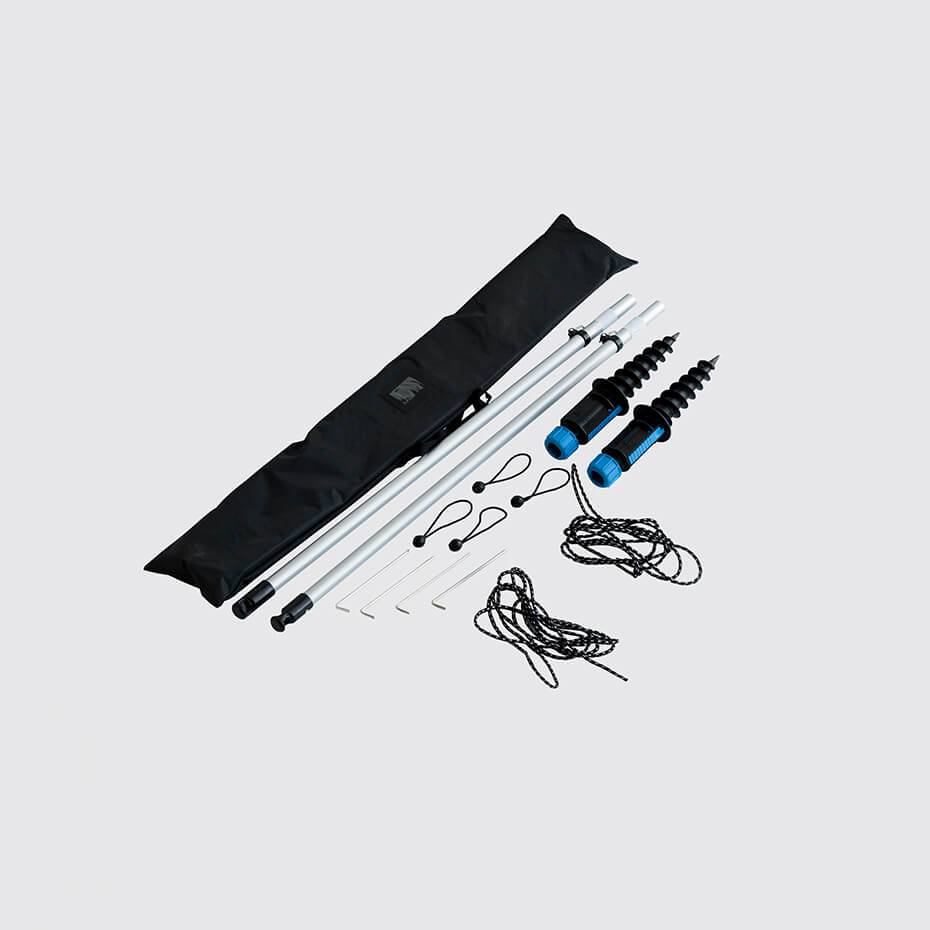 - Innhold: Aluminiumsstang (2 stk), skrufot (2 stk), plugger 4 stk), tau (2 stk), gummistrikk (4 stk), bærebag