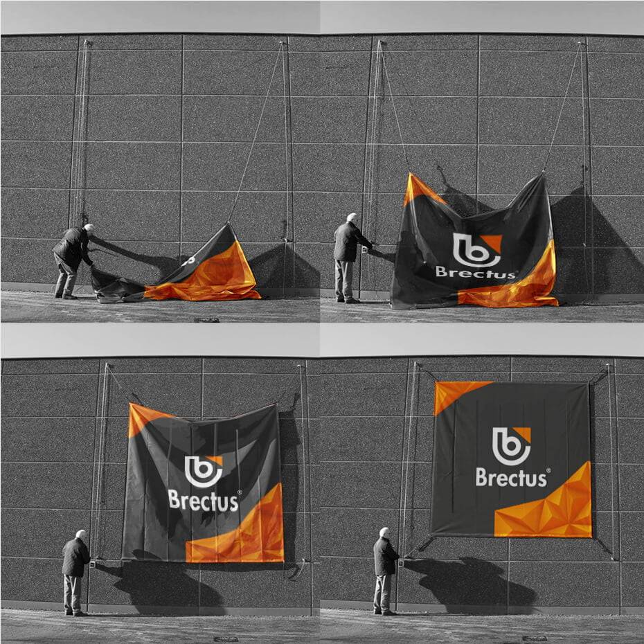 Glem lift, stillas, eller hjelp når banneret skal skiftes. Vårt Spider Opphengssystem kan festes opp til 20 meter høyt og 6 meter bredt, perfekt til utendørs profilering. Montering av et slikt banner oppheng er rask og enkel, da det er få deler som skal festes på selve veggen.