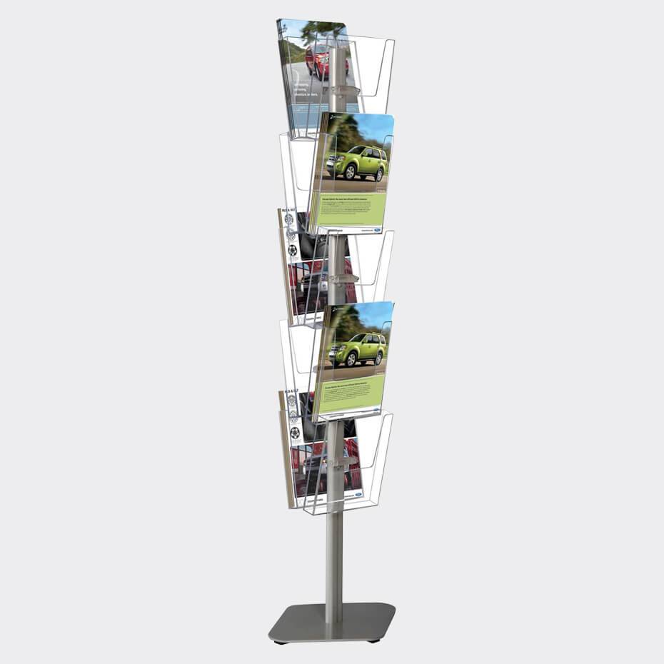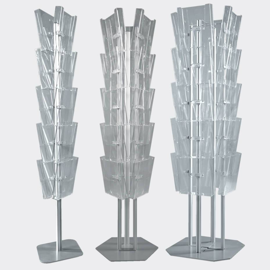 Brosjyrestativ Multi-Side består av tre varianter, hvor du velger den som er best tilpasset ditt behov og miljø. Alle stativene viser brosjyrene fra flere sider, og med sine tunge, grå føtter i pulverlakkert stål er de svært solide og stødige. Bladholder passer ypperlig til butikker, resepsjoner og større messestands. Rask og enkel å sette opp og ta ned.