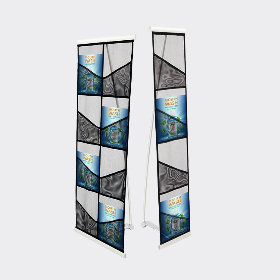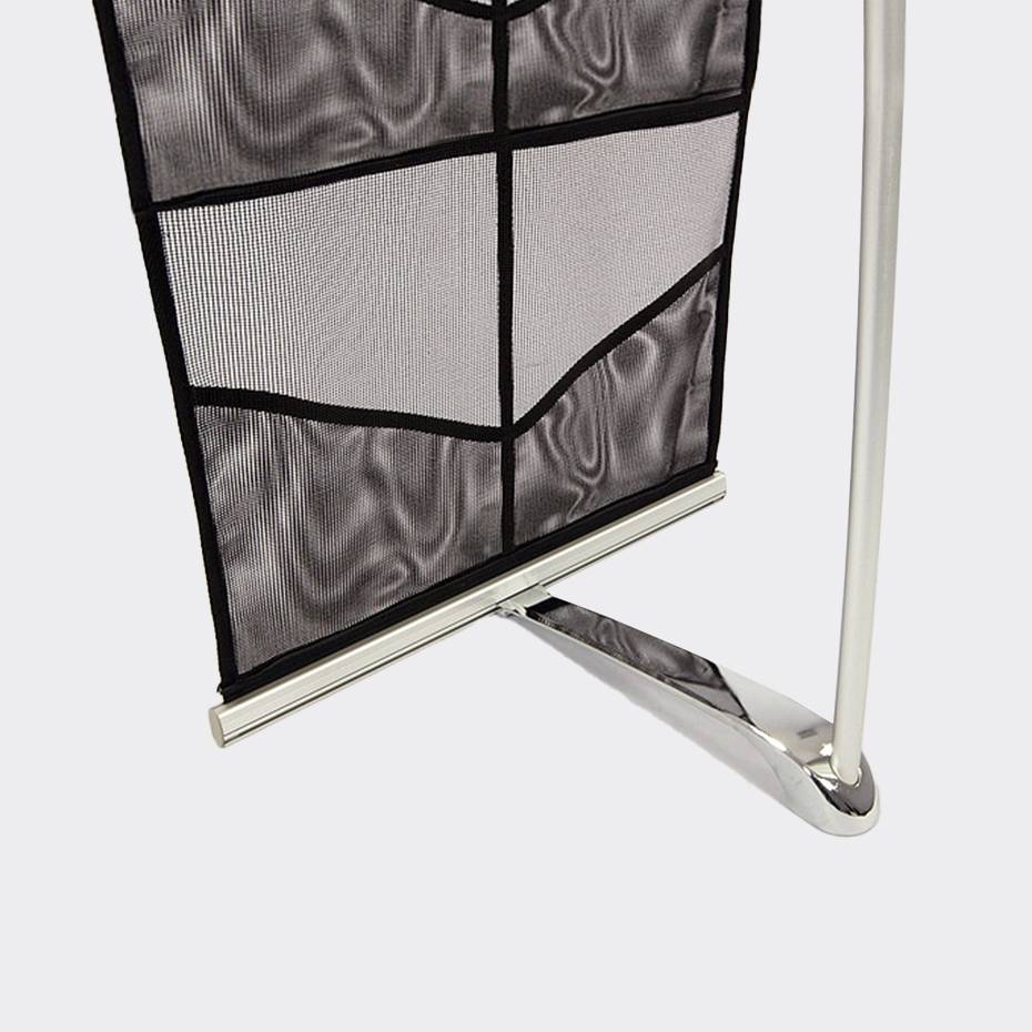 Brosjyrestativ Nett er fleksibelt og lett brosjyrestativ i sølv aluminium og netting, som er rimelig og lett å ta med rundt. passer ypperlig til selgere på farten, messer og arrangementer.