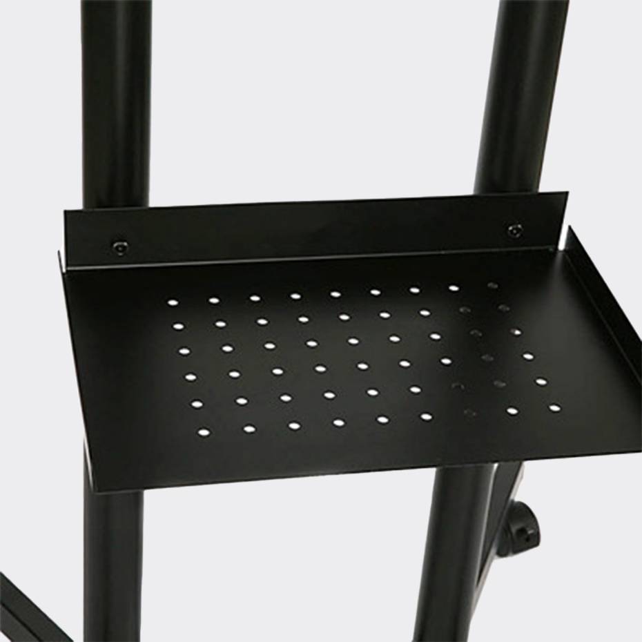 Flott og funksjonelt stativ med hjul for tv og med hylle for nettbrett. Veldig stabil og ideell for messer, utstillingslokaler, konferanserom, møtelokaler etc. Ingen synlige kabler da disse lagres i profilen. TV-stativet kan monteres med flatskjerm TV-er eller skjermer helt opp til 55″.