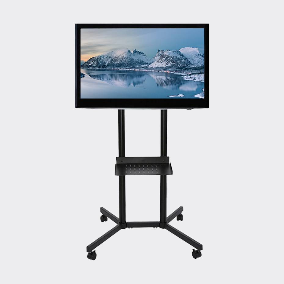 Kombiner gjerne stativ med hjul for tv, med en messevegg, et messebord og en rollup så har du en komplett stand.