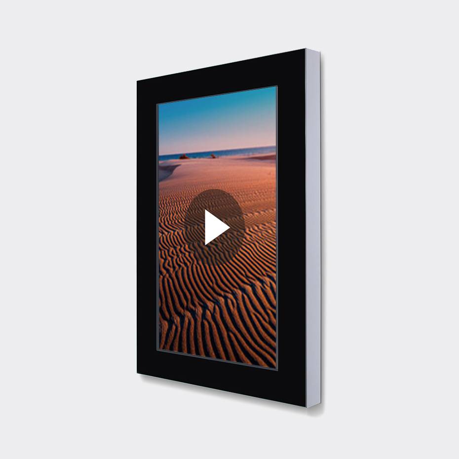 Enkel veggmontering med skruer (ikke inkludert). Rammen er laget av høyherdet sikkerhetsglass for å beskytte den profesjonelle Samsung-skjermen. Tilgjengelig i størrelsene 43″, 50″ og 55″. Skjermen kan leveres med berøringsfolie for å gi berøringsfunksjonalitet (kontakt din selger for mer informasjon). Rammen er produsert i sort, men andre RAL-farger er mulig på forespørsel. Det digitale veggpanelet kan brukes i stående eller liggende retning.