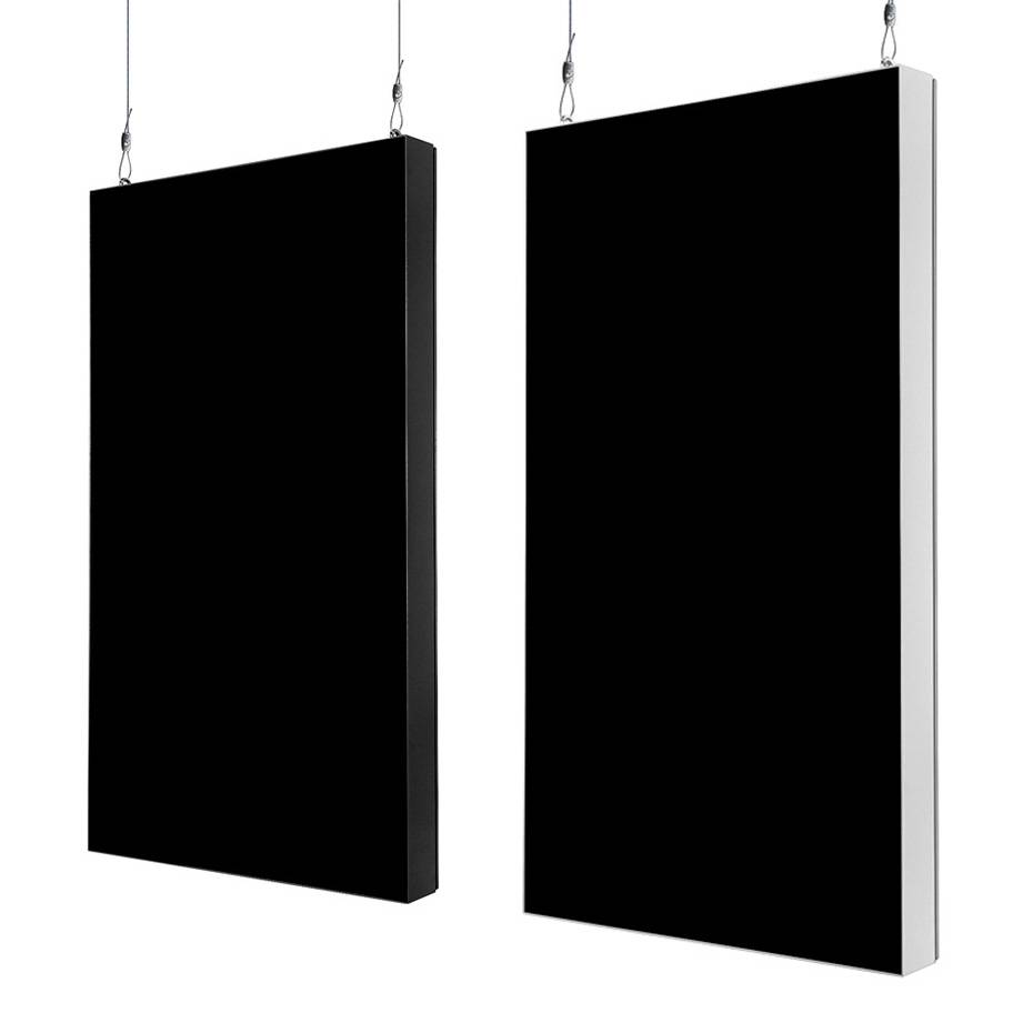 Annonsér eller informer besøkende og kunder med en hengende skjerm. Den tynne rammen gir skjermen et minimalistisk og moderne utseende. Perfekt for å vise budskapet ditt på veggen eller henge i taket bak vinduer. Denne digitale skjermen passer perfekt i shoppingvinduer, hoteller, restauranter, skoler, butikker og museer.
