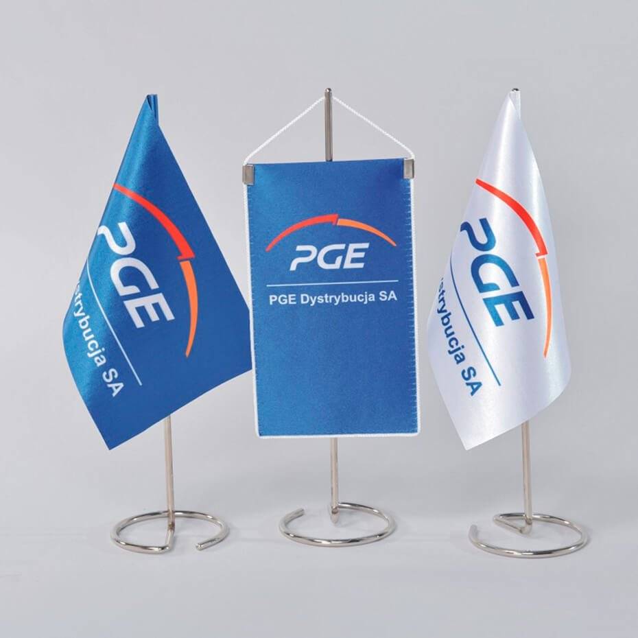 Flott bordflagg og bordfane i satin er prikken over i-en på bordet! Enten det er på kontoret eller oppå messebordet gir de ekstra oppmerksomhet til din logo eller emblem. Flagg til bord fåes også med nasjonalflagg.