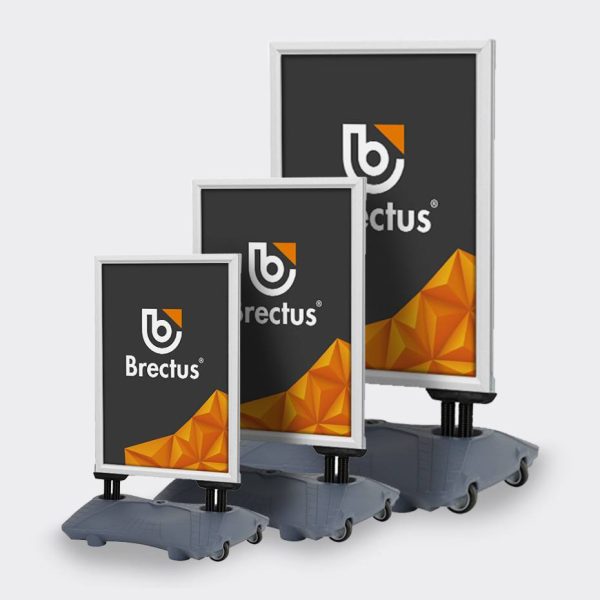 Gatebukk Wind Sign budget er solid og kraftige gatebukker med fjæring. 32mm klemlist ramme og vanndunk m/hjul. 50×70, A1, 70×100.