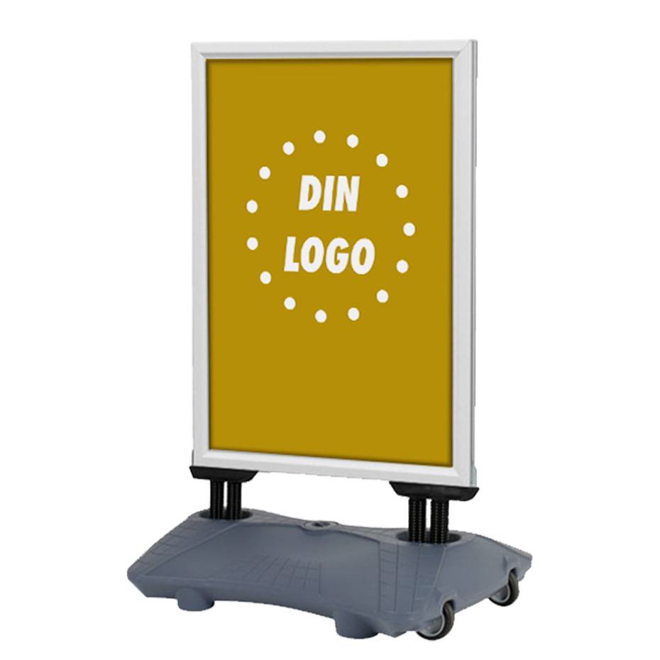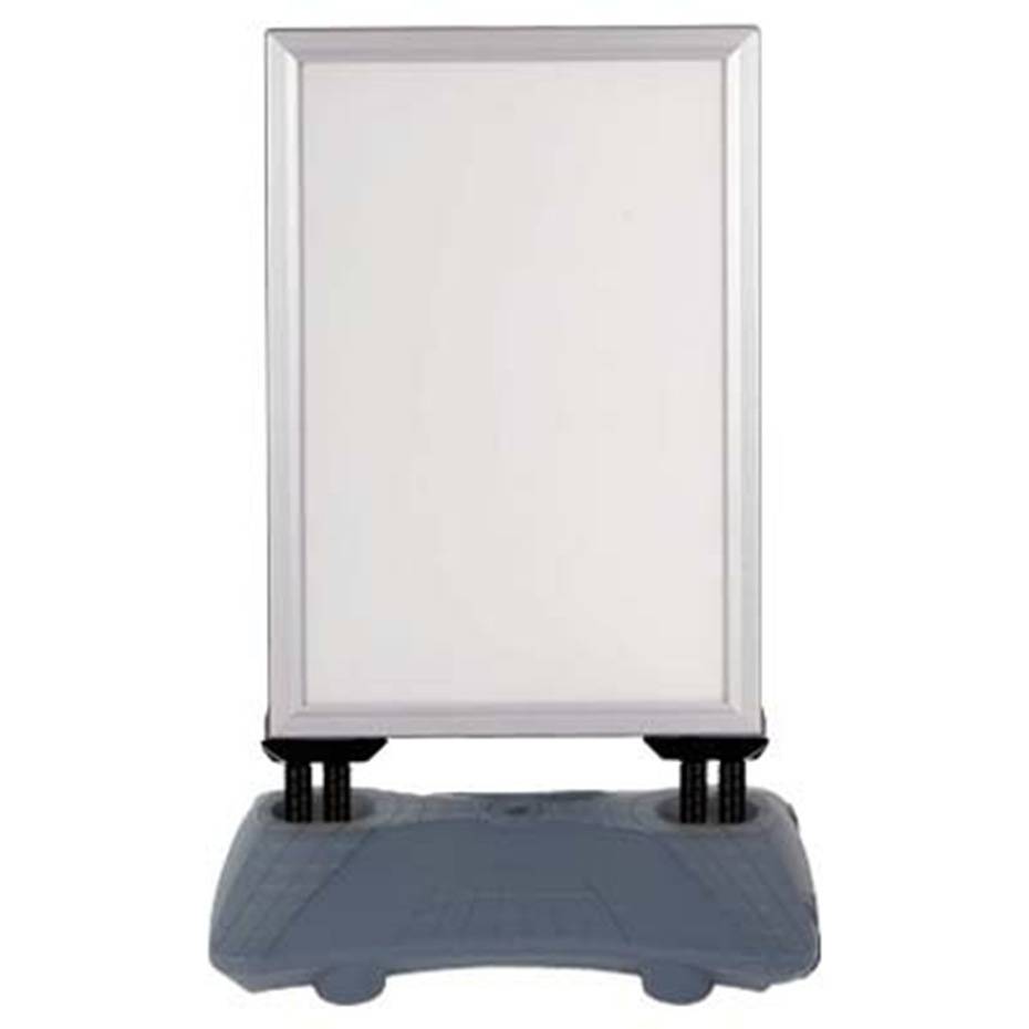 Med Gatebukk Wind-Sign Budget, får du en meget solid, populær og kraftig Hardfør gatebukk, som kan brukes i all slags vær. To kraftige fjærer sikrer dessuten at gatebukken ikke blåser overende i sterk vind, og svart gummiforing gir plakaten ekstra beskyttelse mot fukt og kondens. Gatebukk med vanndunk er produsert med aluminiums-klemlist rammer, og to stk. anti-refleks plastdeksler, sikrer derfor god beskyttelse over plakatene.