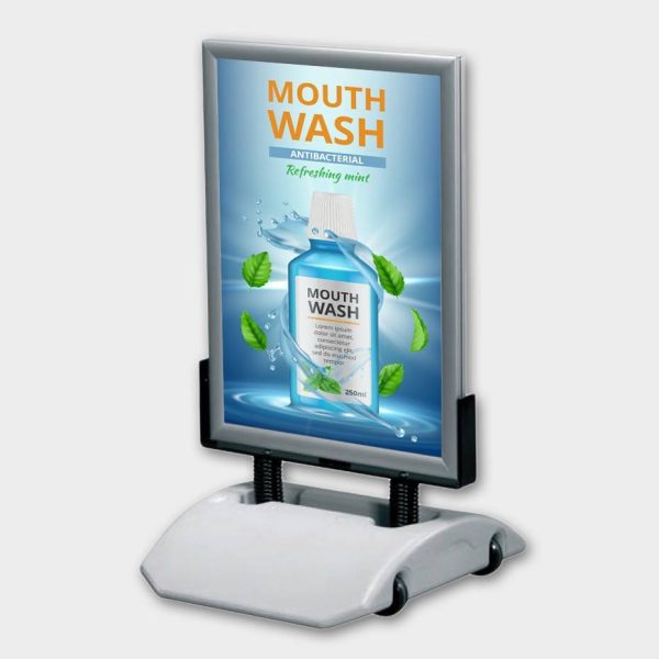 To doble kraftige fjærer sikrer at Gatebukk LED Wind-Sign ikke blåser overende i sterk vind. Foten er dessuten laget av kraftig plast og kan fylles med vann eller sand for å gi en veldig god stabilitet. Husk frostvæske i vannet om vinteren. Gatebukken er lett å plassere og låse. To hjul under gjør den lett å flytte og den er dessuten meget enkel og rask å montere.