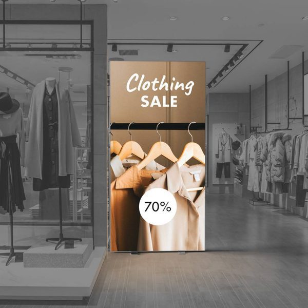 LED-lyset er installert på siden av rammen, og gir presis belysning av utskriften. Med LED-lys vil grafikken din skille seg ut mot et miljø fullt av mønstre og farger, noe som er spesielt viktig hvis du gjennomfører reklameaktiviteter i et kjøpesenter eller på messer.