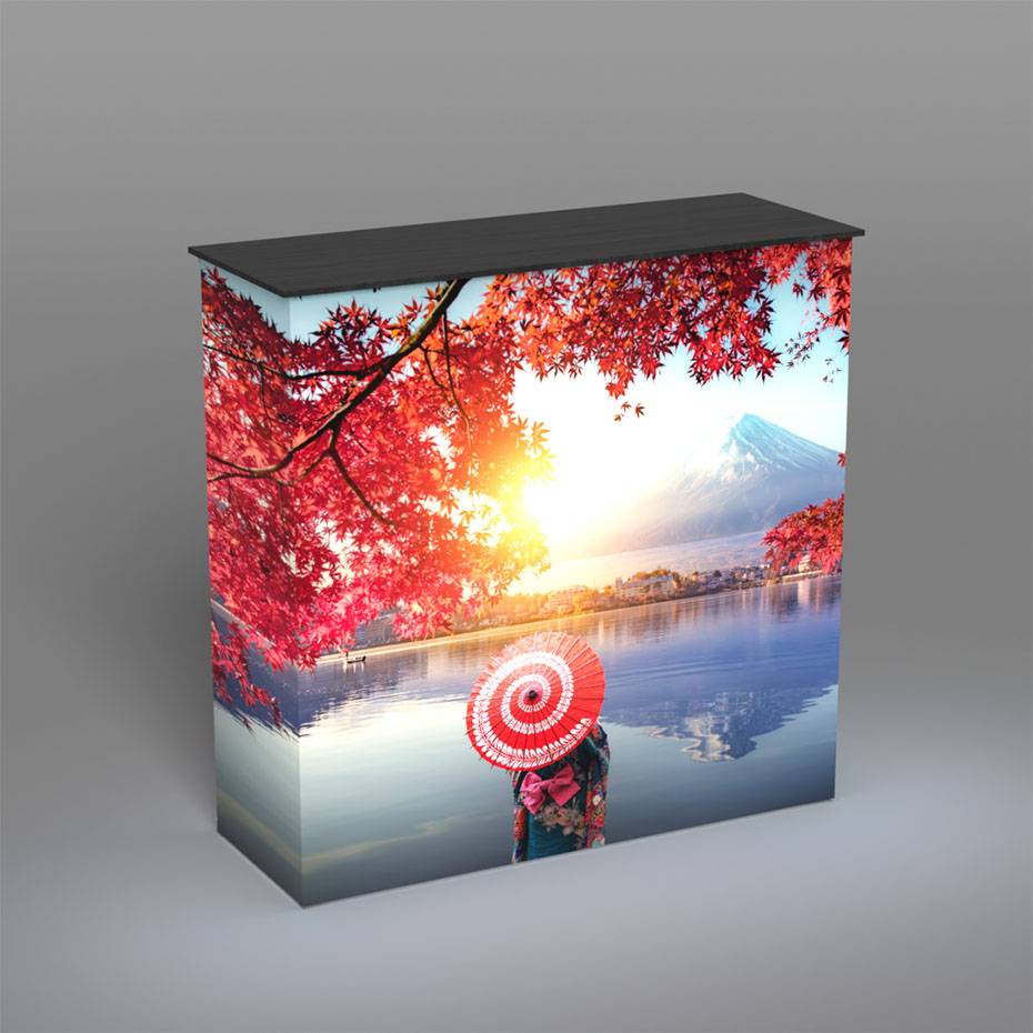 Messedisk med LED-lys er et stilig messebord med innvendig belysning. Med baklyst tekstilduk får du derfor ekstra synlighet på events og shows, og steder med dunkelt lys. Reklamedisk med lys trykkes med ditt budskap, logo eller bilder, foran og på begge sidene. Leveres komplett med trykk og trillebag.