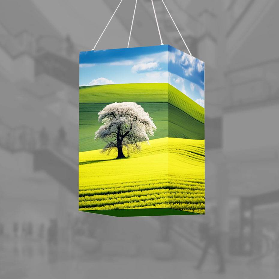 Et suverent blikkfang og kampanje fra taket med 360-graders eksponering på messen! Lyskasse Kube Vertikal er dessuten populære på messer, kjøpesentre, butikker og arrangementer. Det sammenleggbare systemet er også enkelt å sette opp og demontere. Tekstilduken gir fantastisk gjengivelse av farger og en lekker finish. Systemet leveres komplett med grafikk, tau og polstret bærebag.