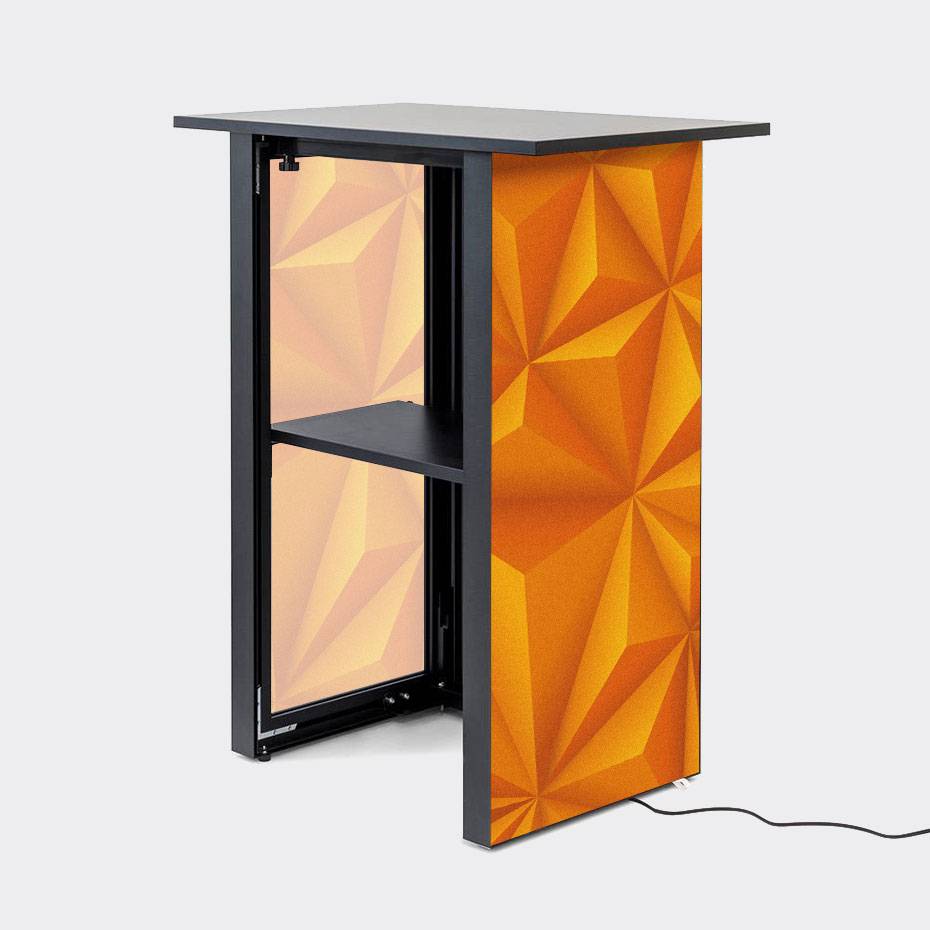 Vårt digitale Messebord har svart SEG-grafikk (Silicon Edge Graphics) på sidene inkludert som standard. Tilpass den digitale disken med eget design på sidene! Trenger du et nytt design senere? Til slutt, bytt enkelt ut SEG-grafikken, og du er i gang!