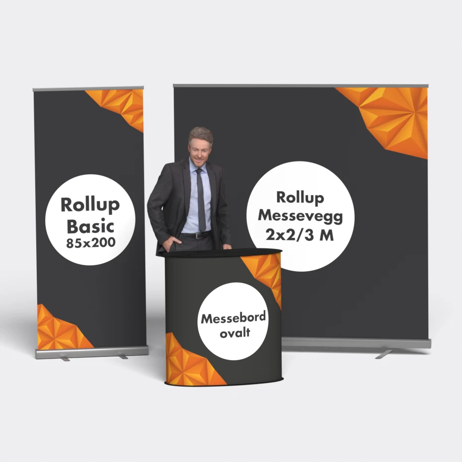 Rollupmesteren er en messepakke som passer perfekt for de som ønsker å sette opp et messestand på 3x3m raskt og effektivt.