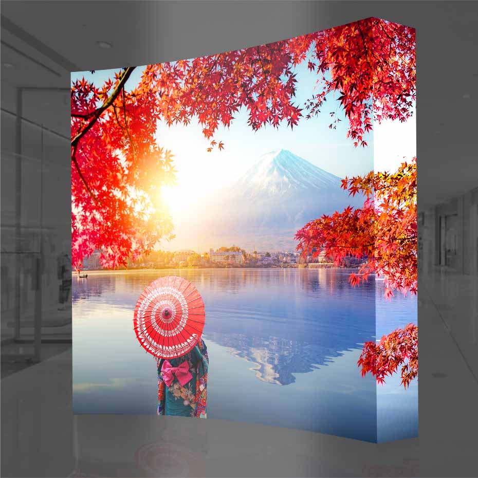 Messevegg Popup Buet LED vegg er en moderne messevegg med tekstilprint for en vellykket messestand eller event! Med baklyst tekstilduk får du ekstra synlighet på events og shows, og steder med dunkelt lys. Trykkes med ditt budskap, logo eller bilder, foran og på begge sidene.