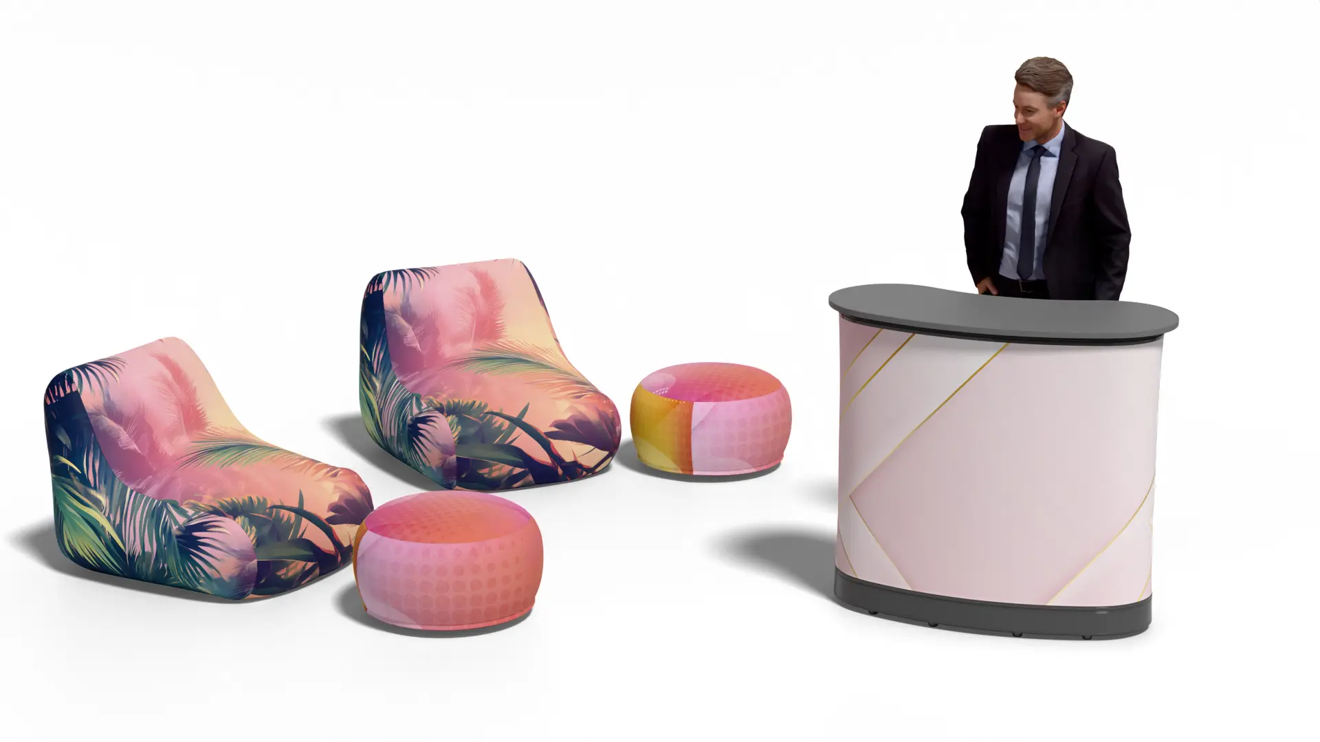 Oppblåsbar Stol passer perfekt til messer, utstillinger, showrooms, kampanjer og eventområder hvor man ønsker en innbydende stand med sittekomfort for besøkende. Når stolen tømmes for luft, tar den minimal plass og er enkel å frakte mellom ulike arrangementer. Dette gjør den ideell for selgere og eventteam som trenger profesjonelle løsninger som er raske å sette opp. Materialkombinasjonen av neopren og PVC gir god stabilitet og slitestyrke, mens tekstiltrekket med trykk sørger for et eksklusivt og profesjonelt uttrykk. Oppblåsbar Stol tåler temperaturer fra −5 °C til +45 °C og kan derfor brukes både inne og ute gjennom store deler av året. Kombiner gjerne med messevegg, messebord eller rollups for å skape en komplett og helhetlig messestand. En stol med trykk gir både funksjonell sitteplass og økt oppmerksomhet rundt din merkevare.
