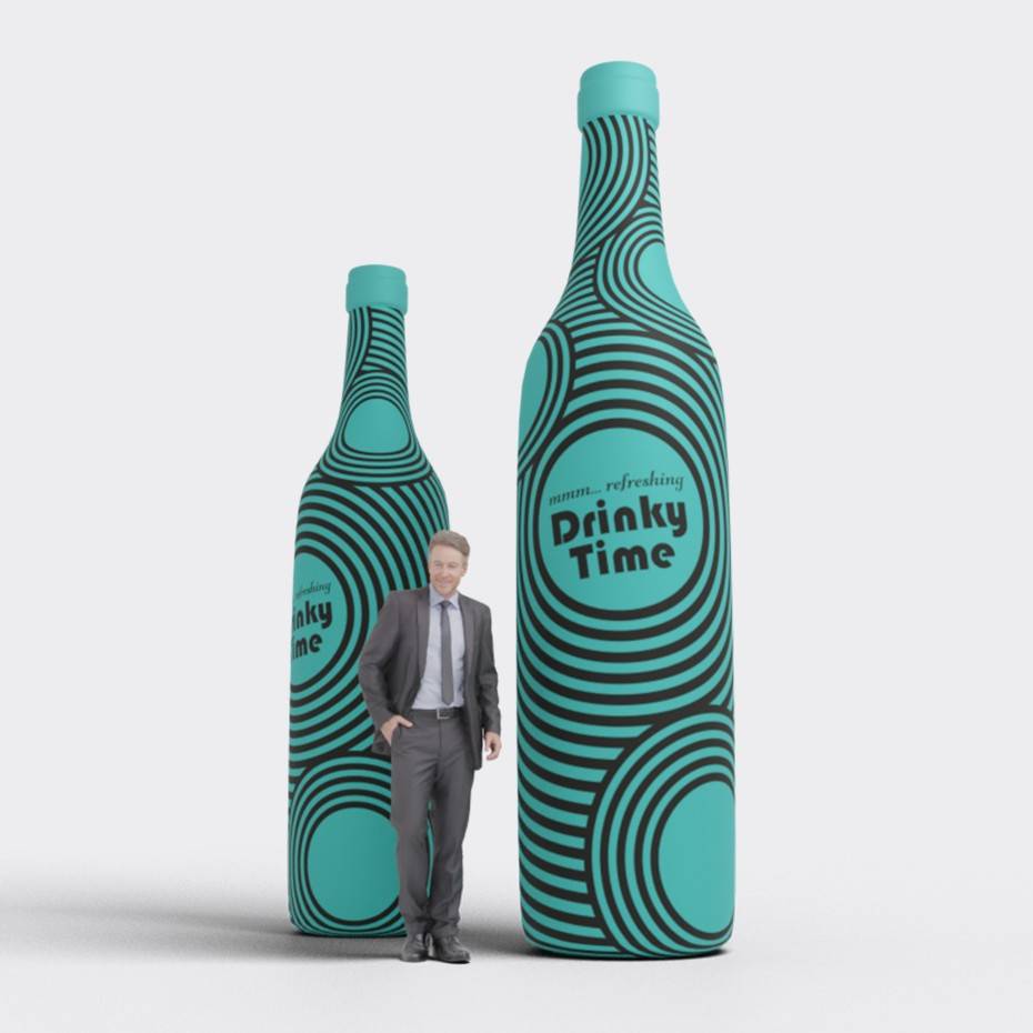 Når det kommer til markedsføring av drikkevarer, finner du hos oss et unikt produkt med synlighets garanti. Flaskeformene skreddersys og gjengis i oversize størrelser helt opp til fire meter høye! Med høy presisjon trykker vi med en fantastisk kvalitet, der alt fra logo til duggdråper gjengis presist. De oppblåsbare flaskene våre er lufttette, lydløse og produseres i brannhemmende materialer for bruk inne på messer o.l.