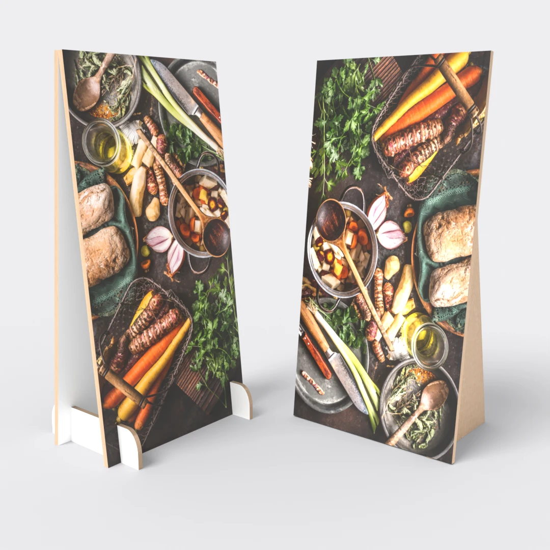 Re-board plakat med fot i den fasongen du ønsker. Et rimelig og tøft alternativ, og dessuten meget miljøvennlig. Lag egne plakater og skilt med Re-board.