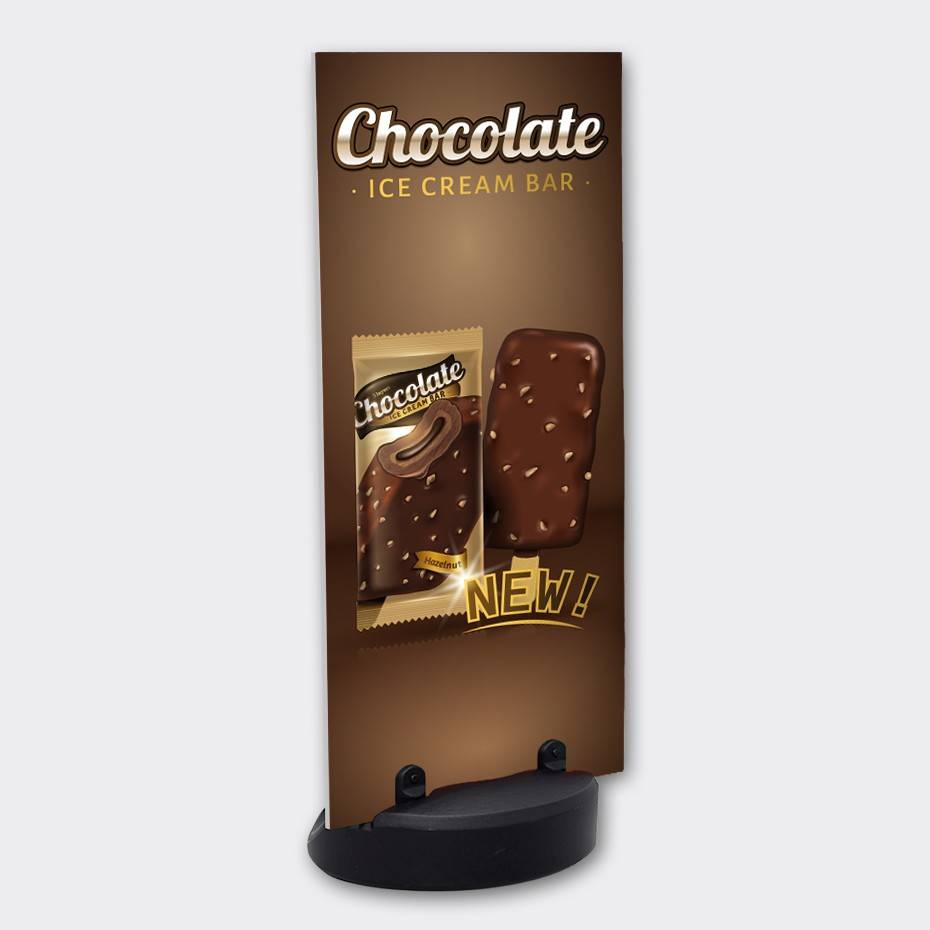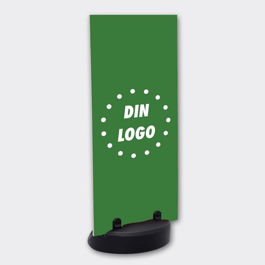 Dette er en solid skilt-holder med en tykkelse på 3-10 mm. Den sorte platefoten i plast kan fylles med 15 liter vann, noe som gjør den svært stødig. Velegnet til utendørs bruk. Fyll på frostvæske hvis det er under 0°C grader. For større plater, bruk flere holdere ved siden av hverandre. Panel grafikk bestilles utenom.